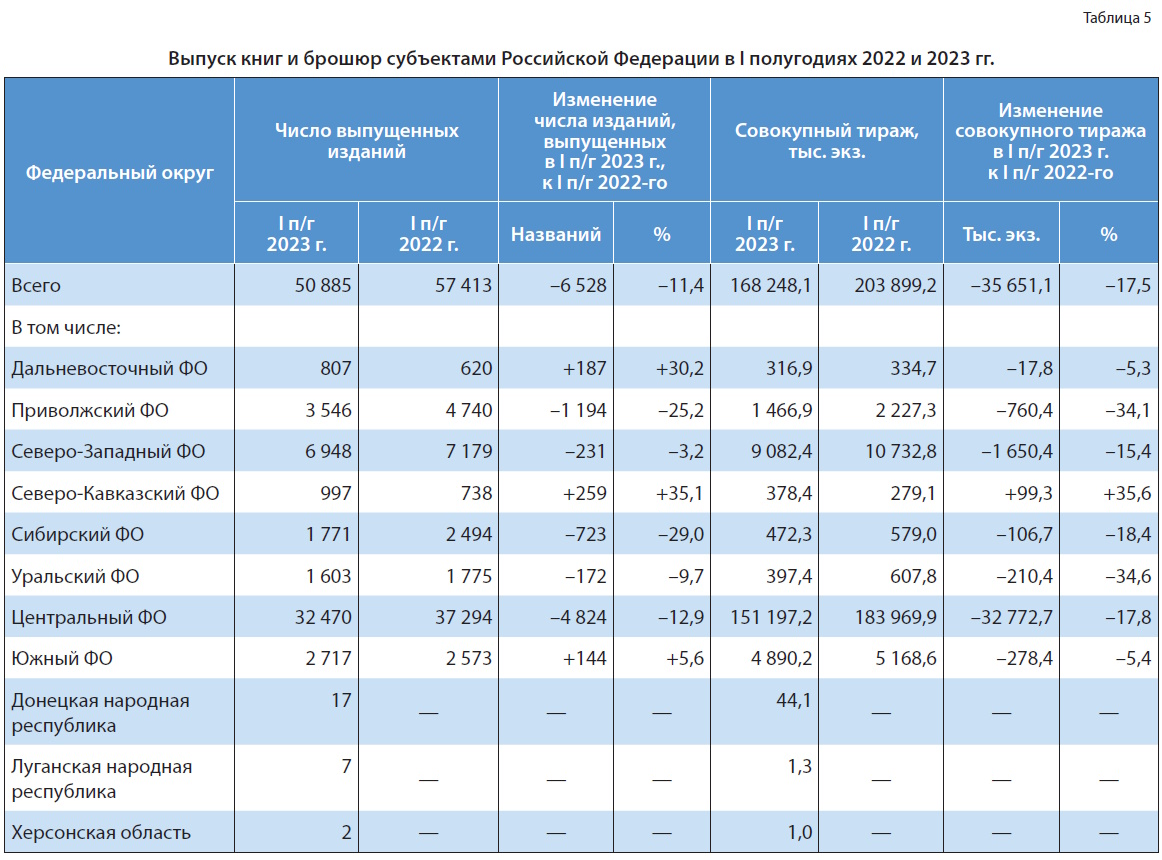 Анализ выпуска книжных изданий по субъектам РФ в I полугодии 2023 г. в сравнении с аналогичным периодом 2022 г. представлен в табл. 5. Как видно из таблицы, наибольший рост числа выпущенных названий зафиксирован в Северо-Кавказском (+35,1%) и Дальневосточном (+30,2%) федеральных округах. Что касается тиражей, то единственным федеральным округом Российской Федерации, где по итогам I полугодия 2023 г. наблюдается рост, является Северо-Кавказский (+35,6%).