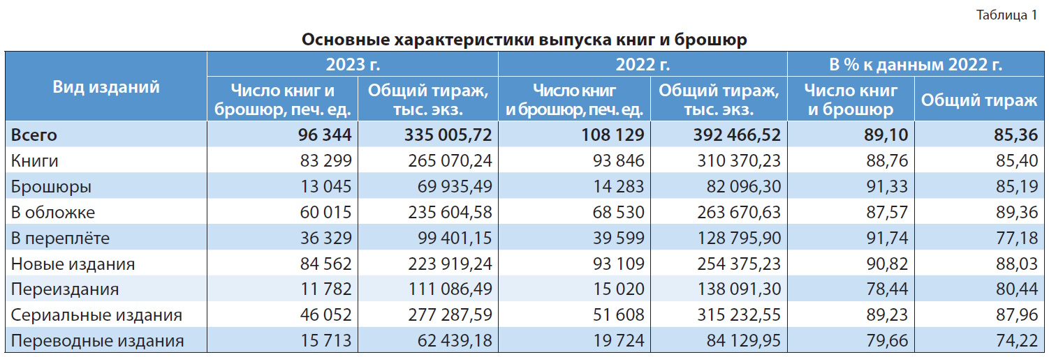 К сожалению, российское книгоиздание в 2023 г. демонстрирует падение по многим параметрам. Как сообщила директор по комплексу «Российская книжная палата» РГБ Елена НОГИНА, число выпущенных книг и брошюр составило 96 344 и снизилось на 11%, их тираж — 335 005,72 тыс. экз. (–14,5%). Это серьёзная величина: даже в годы пандемии падение было меньшим. Число авторефератов диссертаций сократилось на 22,2%. Немного увеличилось поступление нотных и изоизданий. Что касается периодики, то в этом сегменте тоже наблюдается падение и по газетам, и по журналам: в среднем на 5% по числу наименований и более чем на 11% — по тиражу. Особенно сильно по тиражу упали переводные издания (74,2% к уровню 2022 г.) и переиздания (80,4%; табл. 1).