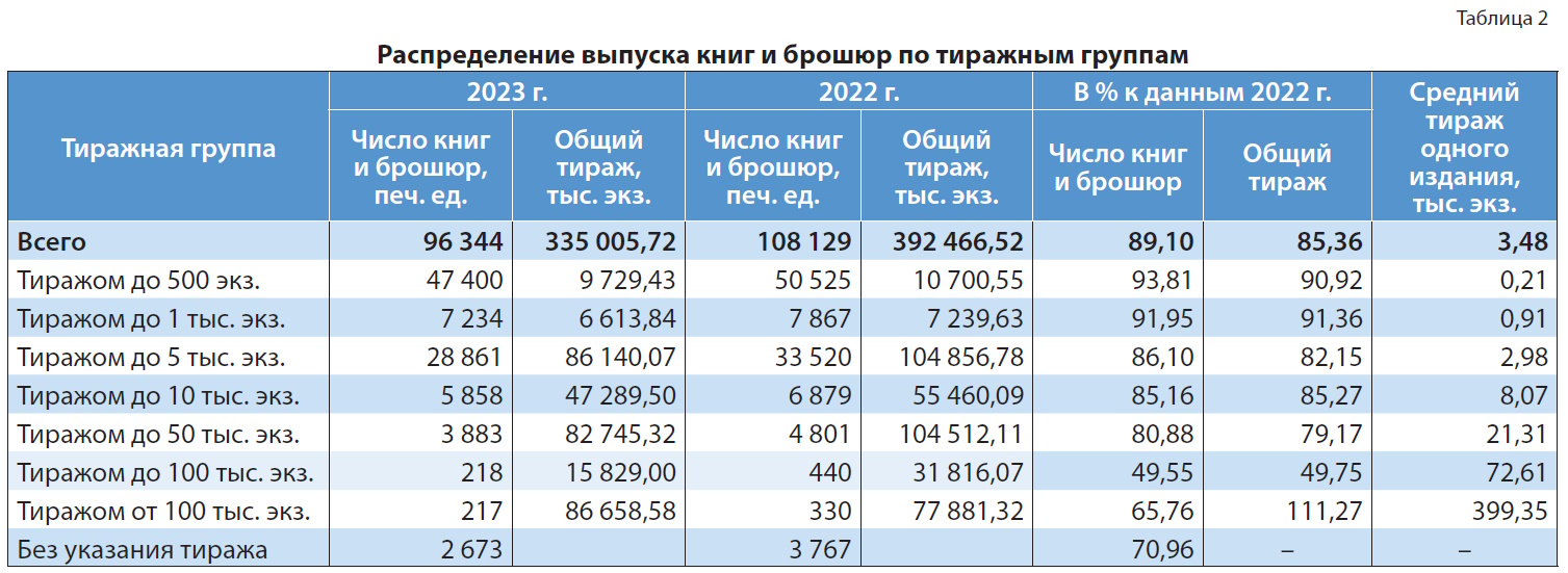 Как и в прежние годы, по числу названий лидирует группа тиражом до 500 экз. (47,4 тыс. названий). При этом наибольшее снижение наблюдается в группах от 50 до 100 тыс. экз. (около 50% к 2022 г.) и более 100 тыс. экз.: 35% к прошлому году (табл. 2).