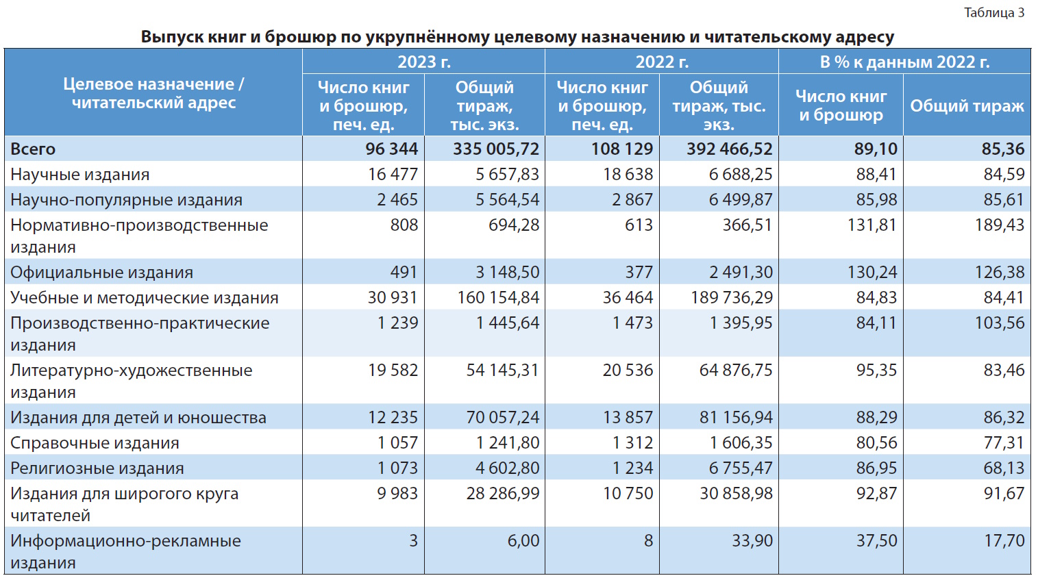 Анализ распределения книжного выпуска по целевому назначению и читательскому адресу показал, что снижение произошло во всех группах, кроме нормативно-производственных и официальных изданий (табл. 3).