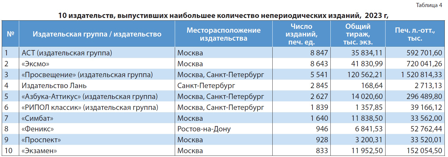 Что касается активности издательств, то лидерами остаются АСТ, «Эксмо» и «Просвещение». При этом на первом месте по числу названий (8847) АСТ, по тиражу (120,5 млн экз.) — «Просвещение» (табл. 4).