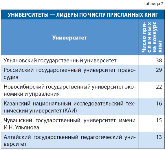 Эксперт поблагодарил всех участников конкурса за внимание к нему, особо отметив вузы, которые прислали больше всего книг (табл. 2).