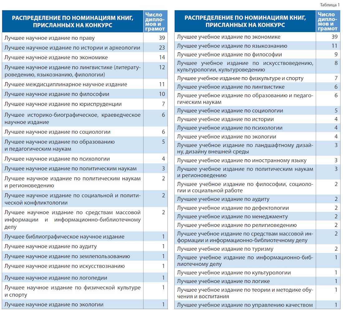 Анализ таблицы показывает, что количество присланных на конкурс научных изданий по экономике и праву оказалось меньше числа учебных изданий по этим направлениям. Больше всего прислано монографий по истории и археологии (23). Несколько иная картина среди учебных изданий: здесь лидируют учебные издания по экономике и праву (по 39), затем следуют учебные пособия по языкознанию (11). Интересно, что достаточно много междисциплинарных монографий (11). Из учебных изданий И. Бикеев отметил учебно-методические комплексы по философии (например, Михайлов К.А., Грачёв М.В. Философия. Университетский учебник в 2 т. Т. 1, 2. 2018), отличающиеся наполненностью, качеством издания.