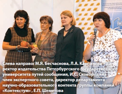 В номинации «Высокая культура учебного издания» были отмечены учебные пособия «Теория антикризисного управления», авторы Т.А. Ванеева, И.В. Мжельская (СГУПС), и учебное пособие «Бухгалтерский учёт на железнодорожном транспорте: теория и практика» под редакцией Г.В. Крафт (ПГУПС).