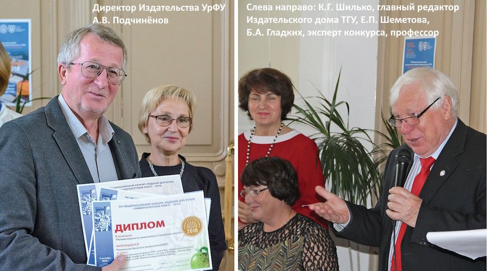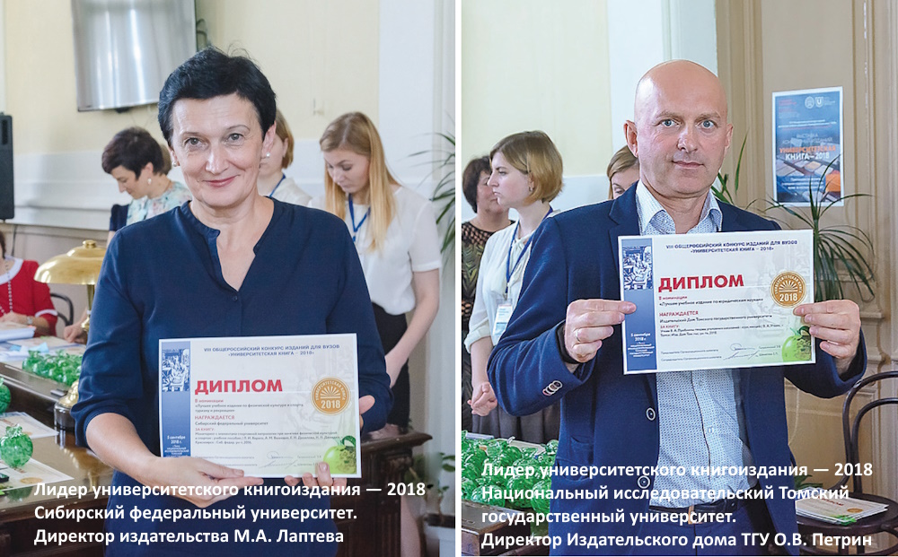 В этом году Золотого диплома и титула «Лидер университетского книгоиздания» были удостоены два вузовских издательства — Издательский дом ТГУ и Издательство СФУ. Но главной интригой церемонии награждения стало вручение Золотого диплома и Гран-при «Лидер университетского книгоиздания — 2018» Издательству УрФУ за уникальные издательские проекты, организацию Уральского межрегионального конкурса «Университетская книга» (2012–2018) и за вклад в развитие университетского книгоиздания.