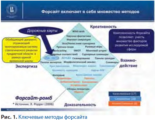 – В отличие от традиционного прогнозирования форсайт позволяет перейти от предугадывания к конструированию того будущего, которое мы считаем наиболее желаемым. Сегодня форсайт используется ведущими мировыми державами для самых разных целей – от разработки социальных программ до позиционирования страны на мировой арене. Форсайт включает в себя множество методов, относящихся к статистике, социологии, экономике, математике. Условно их можно сгруппировать по четырём ключевым категориям (рис. 1).