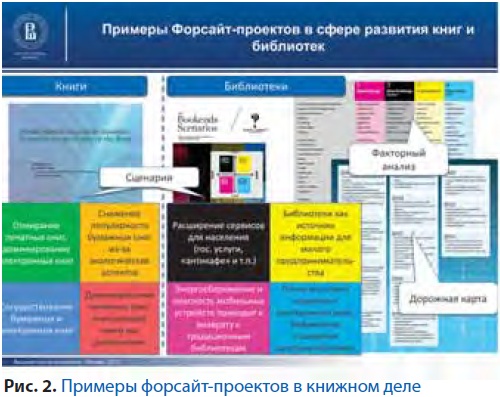 Это план-маршрут по достижению заданных целей развития той или иной предметной области. Используя временную шкалу, удаётся совместить на одном листе бумаги технологии, перспективные продукты, рынки, мероприятия. Тематика книг и библиотек отражена в ряде интересных зарубежных форсайтов, например в долгосрочном японском прогнозе, который завершён в 2010 г. и лёг в основу национальных программ книжного дела. Одним из перспективных продуктов было названо устройство, позволяющее просматривать книги, газеты, прочий контент на нескольких языках в режиме реального времени. То есть ещё в 2010 г. речь шла о продвинутых э-книгах.