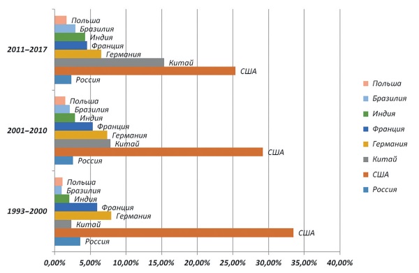 Графически данные табл. 2 можно представить в виде диаграммы (рис. 1), наглядно демонстрирующей долю исследовательских статей России, США, Китая, Германии, Франции и Польши по отношению ко всем статьям, проиндексированным в Web of Science Core Collection в период с 1993 по 2017 г.
