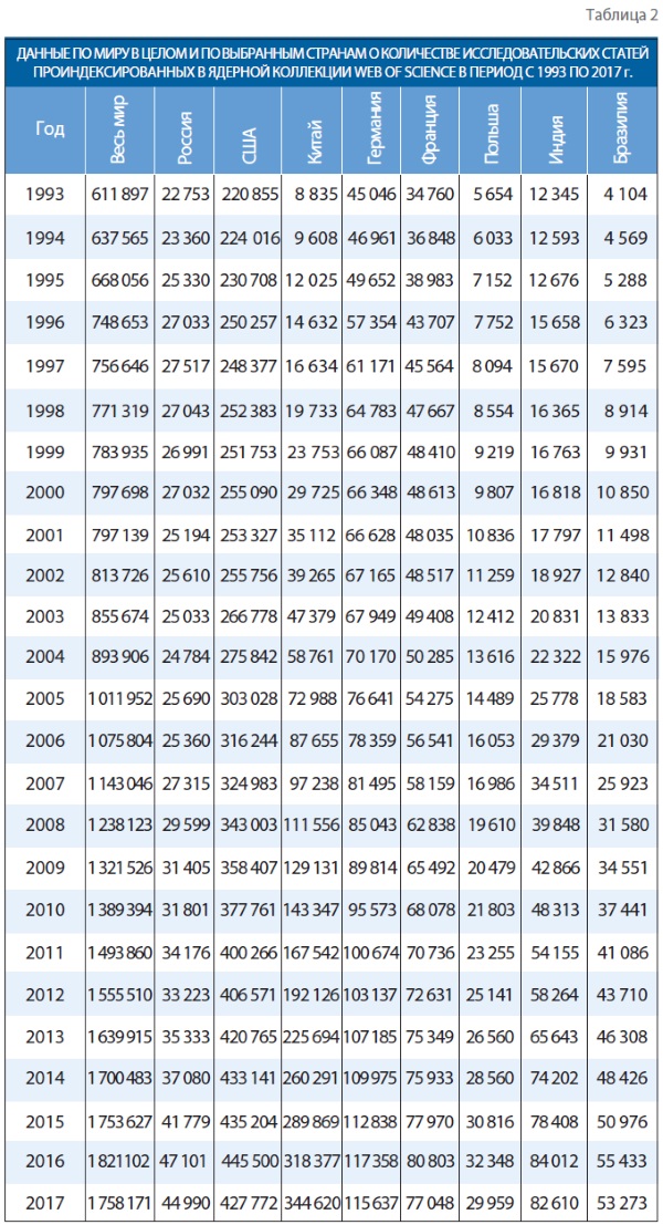Анализ табл. 2 показывает, что в период 2010–2016 гг. в журналах, индексируемых Web of Science Core Collection, российскими учёными было опубликовано 260 493 статьи. В то время как за тот же период учёные США опубликовали 2 919 208 исследовательских статей, т.е. примерно в 11 раз больше!