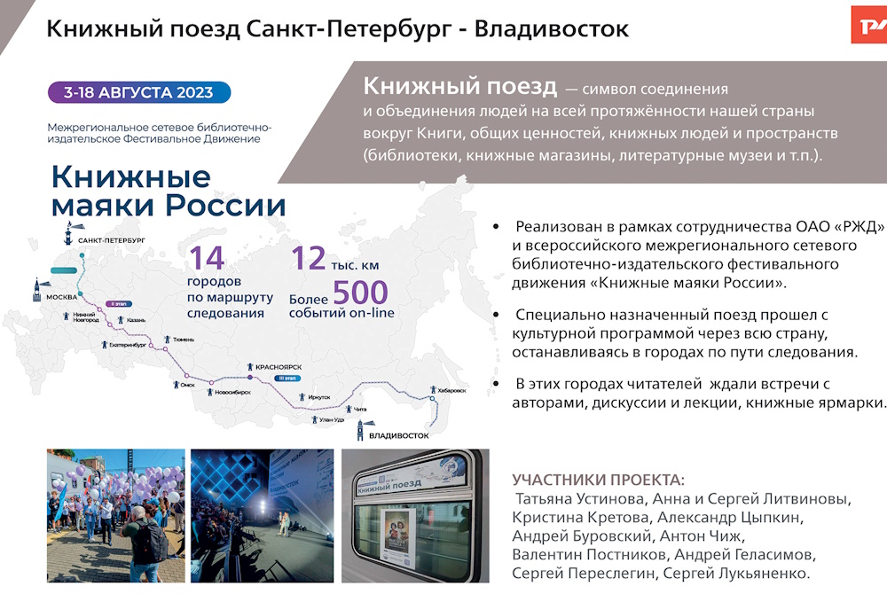 Железная дорога — это, конечно, путешествие. В прошлом году мы реализовали проект с движением «Книжные маяки России» — группой энтузиастов из Санкт-Петербурга, которые предложили нам поехать во Владивосток, где в середине августа состоялся книжный фестиваль. Мы подтвердили гипотезу коллег о том, что путешествие по железной дороге будет наиболее интересным и плодотворным общением с читателями в разных городах по мере продвижения поезда. 3 августа поезд отправился из Санкт-Петербурга, 18-го прибыл во Владивосток. Это было очень интересное путешествие, в котором приняли участие наши ведущие авторы. Проект оказался продуктивным, и в этом году, мы предполагаем, состоится ещё одно путешествие, возможно по другому маршруту.