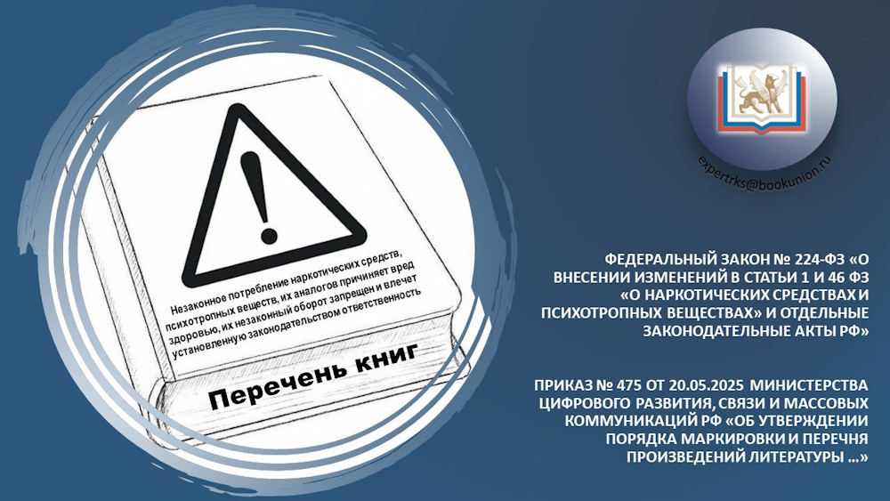 Российский книжный союз напоминает, что в соответствии с дополнением к пункту 2 ст. 46 новой редакции ФЗ книжная отрасль обязана сформировать Перечень промаркированных книжных изданий с упоминанием наркотических средств (включая сленговые выражения), а также способов их хранения, перевозки и пр. информации, перечисленной в п.п. 1-2 пункта 1 ст. 46 №224-ФЗ.