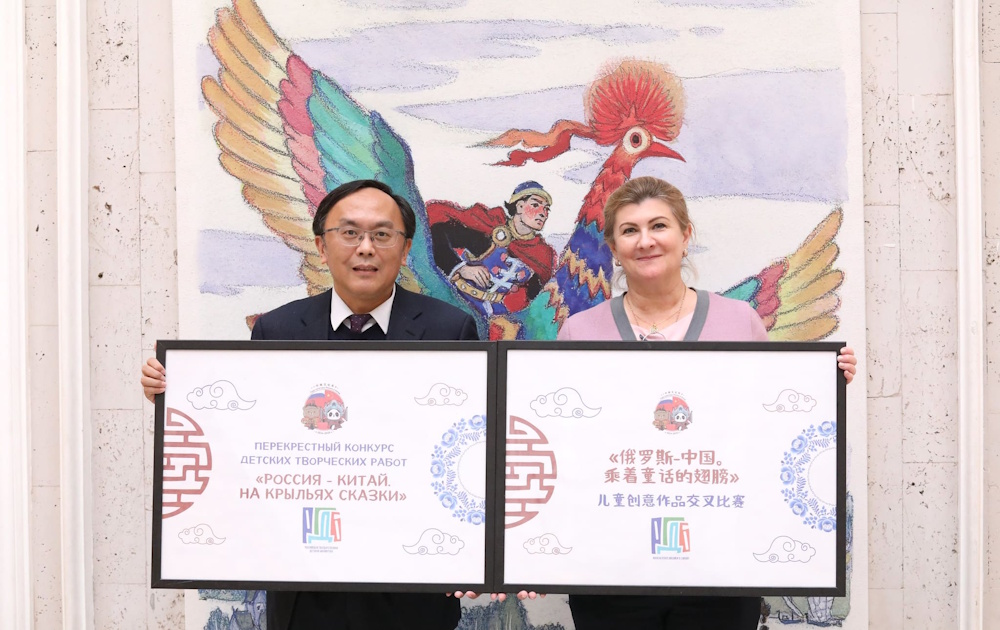 Состоялось открытие выставки по итогам прошедшего в рамках Годов культуры России и Китая Международного перекрестного конкурса «Россия – Китай. На крыльях сказки». Гостей поприветствовали Анжела Лебедева, первый заместитель директора РГДБ, и Тянь Цинцюань, директор Детской библиотеки г. Уханя, КНР. Тянь Цинцюань отметил успех Конкурса и его популярность среди китайских участников, а также выразил надежду на дальнейшее сотрудничество библиотек. В рамках Конкурса в Детской библиотеке г. Уханя прошел цикл мероприятий, посвященных русским народным сказкам, получивших большой отклик от посетителей.