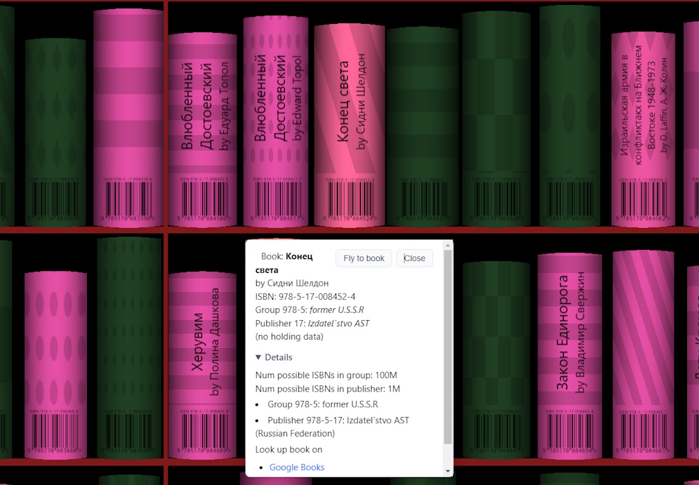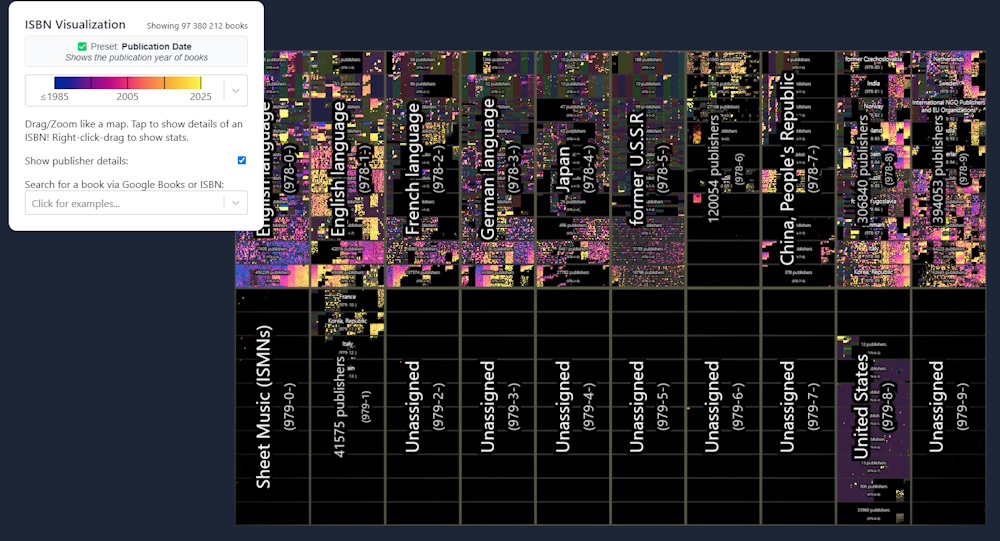 ISBN Visualization представляет собой амбициозный проект, целью которого является создание визуализации обширной базы данных книг, использующих уникальный международный стандартный книжный номер (ISBN). На данный момент в проекте отображается 97 380 212 книг, это мощный шаг к созданию цифровой библиотеки, которая может объединить в себе все значимые литературные произведения.