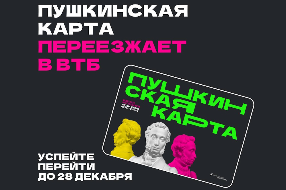 Для сохранения доступа к программе нужно подать заявление на перевыпуск виртуальной Пушкинской карты в ВТБ до 28 декабря включительно. Сделать это можно в приложении «Госуслуги Культура», приложении или интернет-банке Почта Банка, а также во флагманском клиентском центре Почта Банка и ВТБ.