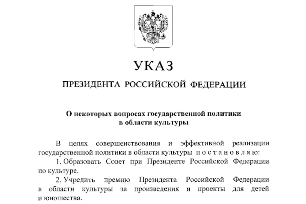 Указом Владимира Путина создан новый Совет при Президенте РФ по культуре и учреждена премия Президента РФ в области культуры за произведения и проекты для детей и юношества.