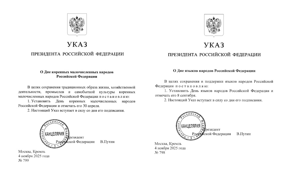 «В целях сохранения традиционных образа жизни, хозяйственной деятельности, промыслов и самобытной культуры коренных малочисленных народов...»,«В целях сохранения и поддержки языков народов РФ» — говорится в указах главы государства.