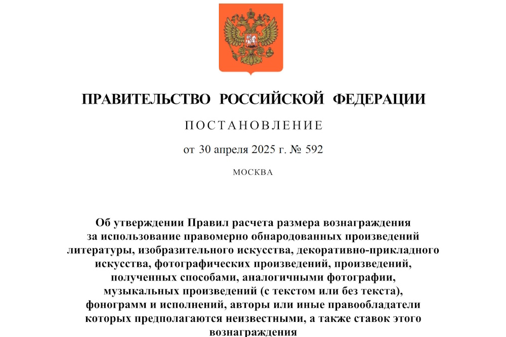 Постановление Правительства РФ от 30.04.2025 N 592 "Об утверждении Правил расчета размера вознаграждения за использование правомерно обнародованных произведений литературы, изобразительного искусства, декоративно-прикладного искусства, фотографических произведений, произведений, полученных способами, аналогичными фотографии, музыкальных произведений (с текстом или без текста), фонограмм и исполнений, авторы или иные правообладатели которых предполагаются неизвестными, а также ставок этого вознаграждения".