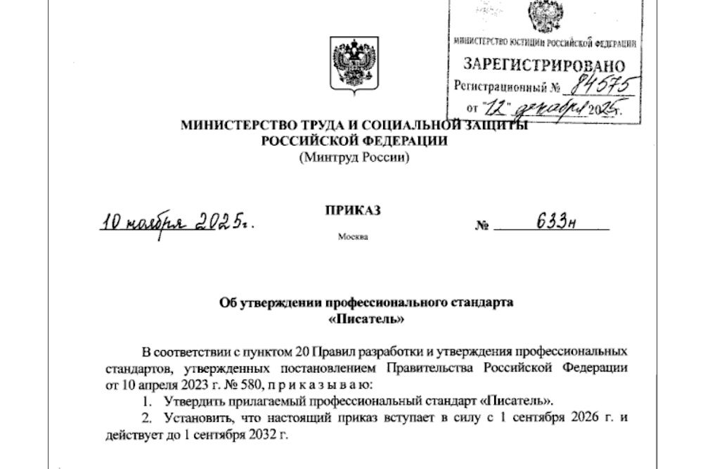 15 декабря 2025 года на официальном интернет-портале правовой информации был зарегистрирован Приказ Министерства труда и социальной защиты Российской Федерации от 10.11.2025 № 633н "Об утверждении профессионального стандарта "Писатель". Он вступает в силу с 1 сентября 2026 года и будет действовать до 1 сентября 2032 года.