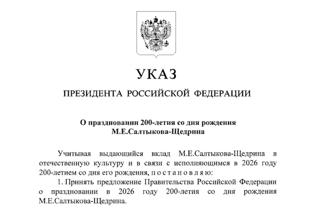 Президент РФ Владимир Путин поддержал предложение Правительства провести в 2026 году празднование 200-летия со дня рождения писателя Михаила Салтыкова-Щедрина, сообщает ТАСС. Указ опубликован на официальном интернет-портале правовой информации.