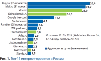 Из 15 крупнейших интернет-проектов пять – это социальные медиа (рис. 1), причём самые крупные игроки – локальные отечественные площадки – «ВКонтакте» (23 млн человек) и «Одноклассники» (16,5 млн человек). Довольно активно растут Facebook и Twitter.
