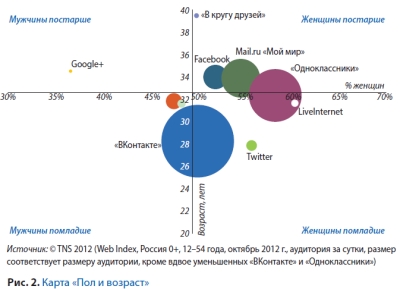 Анализ показывает, что социальные медиа в целом «населяет» женская аудитория, за исключением Google+. Её средний возраст можно оценить в диапазоне 32–36 лет (рис. 2).
