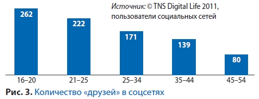 Хотя и принято считать, что в России социальные медиа развиваются наиболее активно, количество «друзей» на одного пользователя у нас пока ещё на среднем мировом уровне. Если в США примерно 250 «друзей» на человека, то в России – 160. Возможно, играет роль языковой барьер: российские пользователи, как правило, общаются со своими соотечественниками. Очень ярко выражена зависимость между количеством «друзей» и возрастом пользователей (рис. 3).