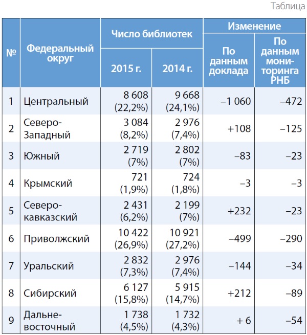 По данным РНБ (доступны в Интернете по адресу http://clrf.nlr.ru/analitika), в 2015 г. положительная динамика отмечена в семи субъектах и составляет всего 12 библиотек на всю страну, но никак не сотни, как в докладе. Укрупнённые данные по федеральным округам, которыми оперирует доклад, не позволяют увидеть реальную картину, которая складывается при рассмотрении данных по всем субъектам РФ. В Ставропольском крае и в Костромской области число библиотек выросло на три, в Томской области на две, в Республике Северная Осетия — Алания, Краснодарском крае, Астраханской и Ленинградской областях по одной новой библиотеке.