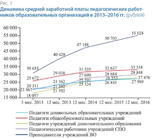 Средняя заработная плата педагогических работников образовательных организаций в течение 2013–2016 гг. непрерывно росла (рис. 1).