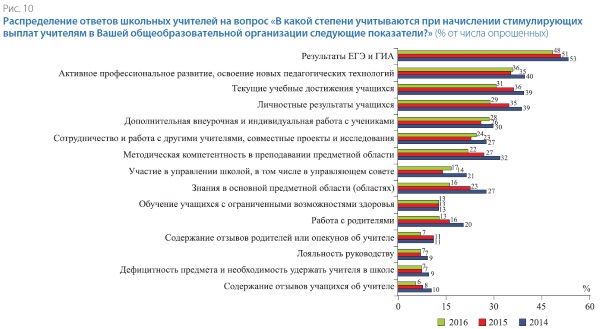Результаты опроса педагогических работников в рамках МЭО показывают, что стимулирующие выплаты руководители организаций во многом стали связывать с профессиональной активностью педагогов и результатами воспитанников (обучающихся) (рис. 9 и 10).