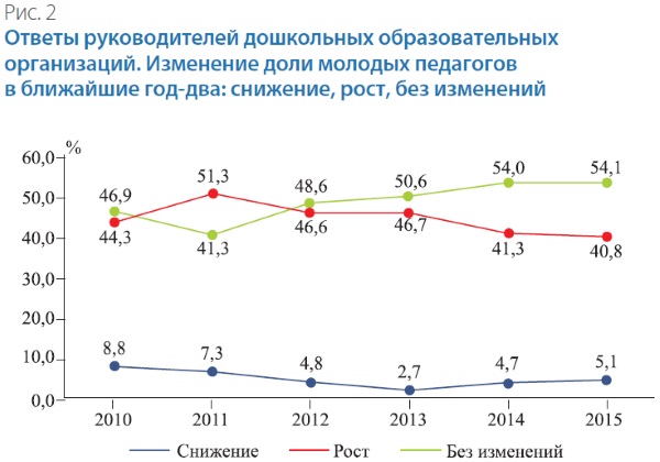 По данным Росстата, в 2015 г. в 57 субъектах Российской Федерации увеличилась численность молодых педагогов (до 35 лет). По результатам проведённого опроса руководителей дошкольных образовательных организаций, треть из них отметили рост числа молодых специалистов, ещё выше доля руководителей, которые ожидают роста доли молодых педагогов в ближайшие годы (рис. 2).