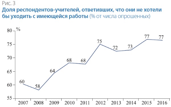 На основе данных мониторинга экономики образования (МЭО) к серьёзным позитивным явлениям в сфере образования можно отнести рост (с 54 % в 2010 г. до 76 % в 2016-м) доли педагогов, которые не согласились бы ни при каком уровне оплаты перейти на другую, более высокооплачиваемую, работу или затруднились назвать этот уровень.