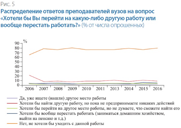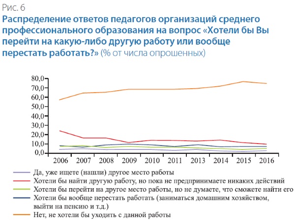 С начала 2000‑х гг. наблюдается постоянный рост доли учителей, которые не хотят уходить с имеющейся работы, в 2016-м доля таких респондентов составила 76,6 % (рис. 3 и 4). Доля тех, кто уже ищет другую работу, за 10 лет снизилась с 3 до 1 %, а желающих уйти, но пока не предпринимающих попыток — с 17 до 8%.