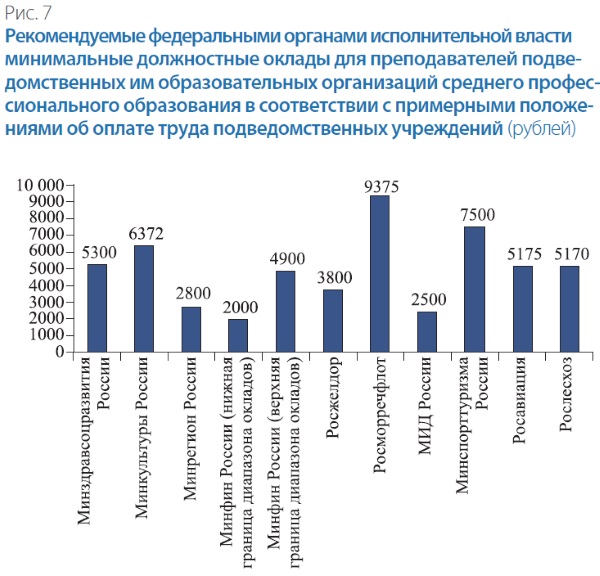 Достаточно активно в связи с переходом на эффективный контракт в обществе обсуждается вопрос структуры оплаты труда: соотношения базовой и стимулирующей частей и их наполнение. Ведомства и учредители по‑разному подходят к решению этого вопроса. На примере сферы образования можно наблюдать, как складывается ситуация, когда одни федеральные ведомства устанавливают минимальные должностные оклады для подведомственных им образовательных организаций (Минздрав России, Минкультуры России, Минсельхоз России и др.), другие — не делают этого (Минобрнауки России). В том случае если минимальные должностные оклады для федеральных учреждений образования устанавливаются, они могут значительно различаться в зависимости от принадлежности образовательной организации к тому или иному федеральному ведомству (рис. 7).