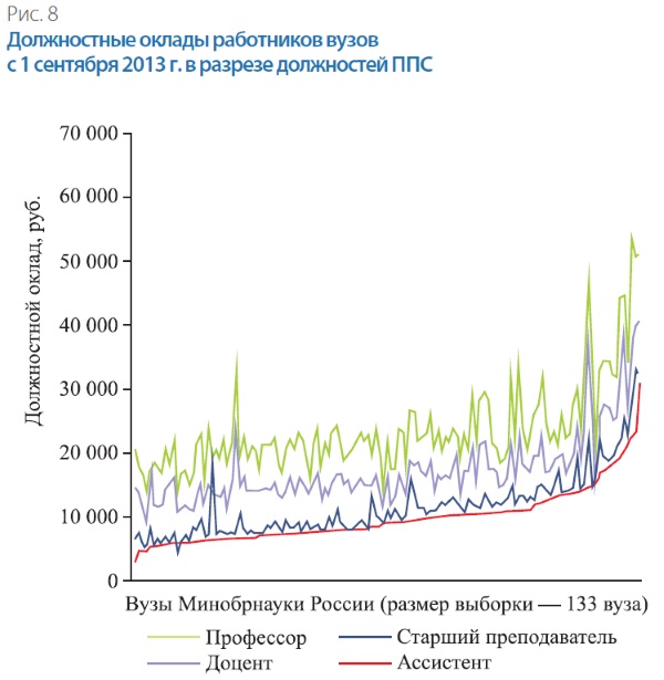 Аналогичная ситуация наблюдается и в вузах, подведомственных Минобрнауки России, для которых учредитель не устанавливает единый базовый оклад. Дифференциация размера базового оклада профессорско-преподавательского состава происходит уже на уровне самих вузов. Разброс может достигать 5–10 раз (рис. 8).