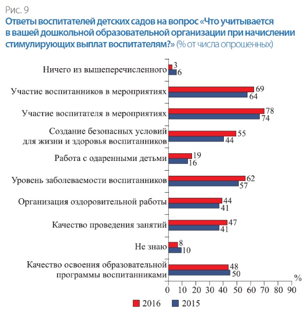 Так, воспитатели дошкольных образовательных организаций чаще отмечают, что при стимулировании в их организации учитывается участие педагогов и воспитанников в мероприятиях, создание безопасных условий для жизни и здоровья воспитанников и уровень заболеваемости воспитанников.