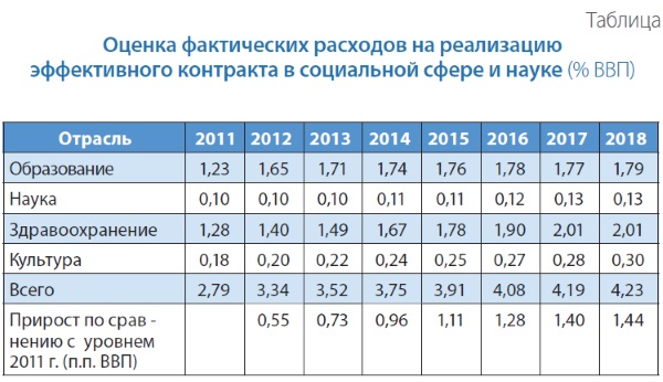 В 2012–2016 гг. расходы на реализацию эффективного контракта постепенно увеличивались, однако это происходило медленнее, чем предполагалось первоначальным планом. К 2013 г. объёмы фонда оплаты труда целевых категорий, согласно оценкам, основанным на прямых данных федерального статистического наблюдения, достигли 2,7 % ВВП (табл.).