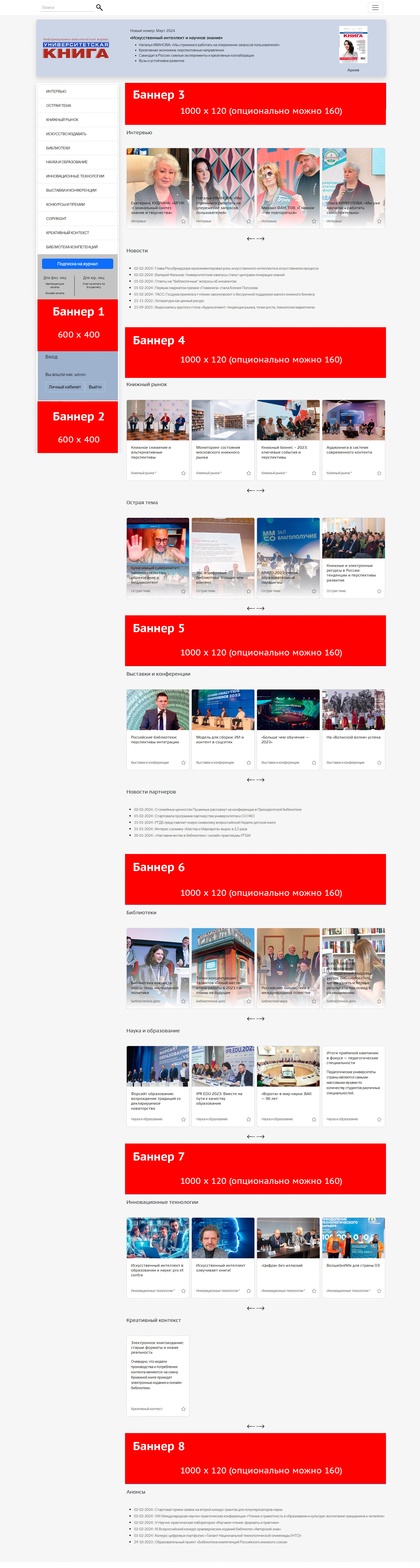 | Центр страницы (над рубрикой «Библиотеки»), несквозной (№ 6) | 1000*120 | 4 900 | 15 700 |