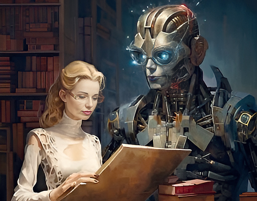 Иллюстрации на тему «ИИ среди издателей и библиотекарей» созданы С. Морозовой с использованием DALL-E 3, Midjourney V 5.2 и набора последовательных и уточняющих промптов.