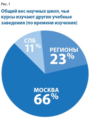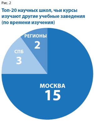 Несмотря на констатируемый выше разнородный характер российского образовательного поля, национальный рейтинг демонстрирует неоспоримое доминирование столичного высшего образования в пределах страны. По совокупному весу научные школы Москвы привлекают 2/3 всего интереса пользователей, а если проанализировать первую двадцатку, то там доля Москвы ещё выше — 3/4 всего интереса.