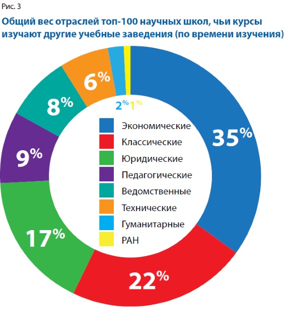 Многолетние попытки федеральных и региональных чиновников перенаправить предпочтения абитуриентов от экономических и юридических специальностей к инженерно-техническим, медицинским и педагогическим пока не дают решающих результатов. Так, в первой сотне 20% технических вузов, но на изучение их учебных курсов уходит лишь 6% времени на платформе (рис. 3).