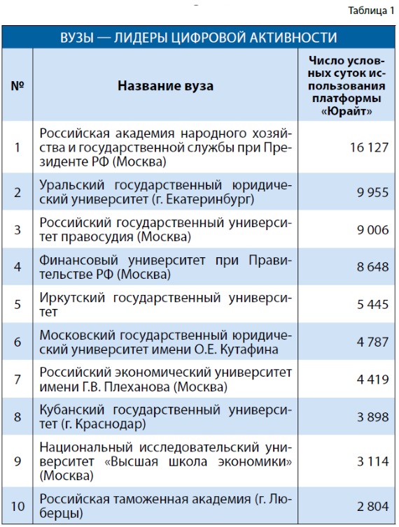 Министр науки и высшего образования РФ В.Н. Фальков на заседании рабочей группы 27 марта 2020 г. поручил организовать сбор информации об эффективности использования цифровых ресурсов. Предложенный командой «Юрайт.Статистика» рейтинг составлен на основе цифровых следов различной деятельности студентов и преподавателей на образовательной платформе «Юрайт»*.