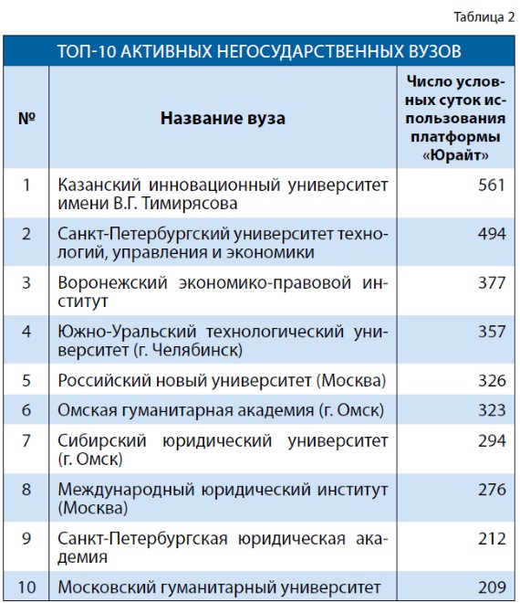 В отличие от устоявшегося стереотипа о низком качестве образования в негосударственных вузах данные «Юрайт.Статистики» говорят о достаточно высокой цифровой активности отдельных образовательных учреждений (табл. 2).