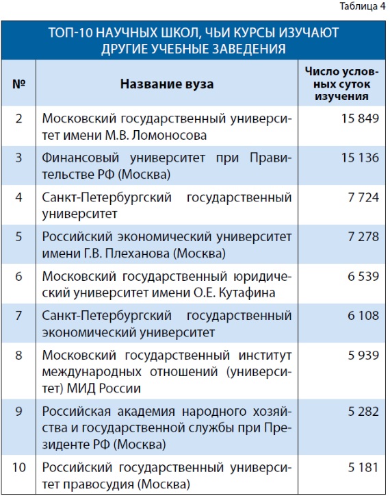В лидеры по разным видам подсчётов входит пятёрка университетов: МГУ имени М.В. Ломоносова, Санкт-Петербургский государственный университет (СПбГУ), НИУ ВШЭ, Финансовый университет при Правительстве РФ и РЭУ имени Г.В. Плеханова. Если места первых двух университетов очевидны, то три последующих показывают тенденцию российской образовательной системы. Постепенно сильные экономические вузы с распределённой филиальной сетью в регионах преодолевают свою отраслевую специфику и движутся в сторону модели классического университета.