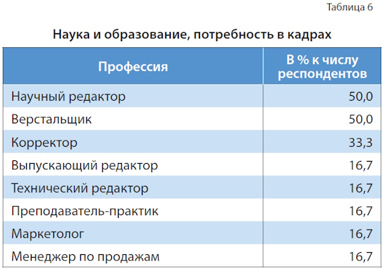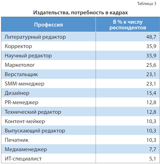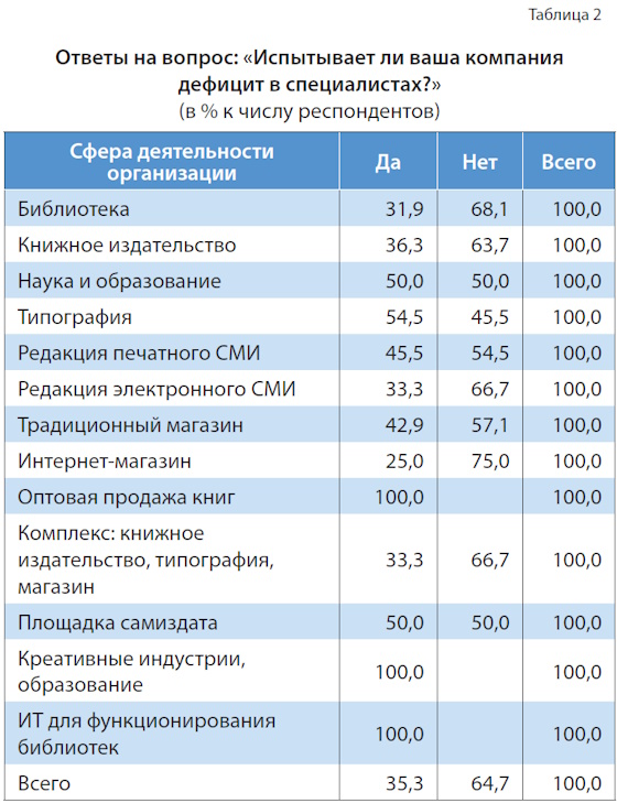 Дефицит в специалистах испытывают свыше трети респондентов, в том числе 31,9% библиотек и 36,3% книжных издательств. При этом анализ кадровой потребности неожиданностей не выявил: как правило, компании ищут специалистов по своему профилю.