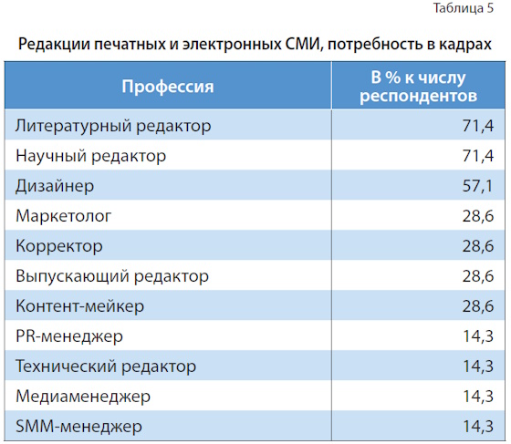 «Библиотеки испытывают кадровый голод» — так охарактеризовали ситуацию коллеги из Ставропольской краевой библиотеки для молодёжи имени В.И. Слядневой. Поскольку библиотека уже становится настоящим медиа, 20% респондентов заявили о том, что им требуются SMM-специалисты и дизайнеры, 17,5% — литературные редакторы, 15% — PR-менеджеры. Интересно, что редакции печатных и электронных СМИ испытывают одинаково высокую потребность и в литературных редакторах, и в научных (71,4%). Очевидно, это связано с профилем деятельности участников исследования, в основном представленных профессиональными изданиями. В частности, научного редактора по узкой научной тематике, переводчиков научных и специальных текстов ищут в ООО «Лаборатория знаний». «У нас специфика научного редактирования: хорошее знание не только историко-литературного контекста, но и книжной культуры в целом», — пояснили в ФГБУ Научный и издательский центр «Наука» РАН.