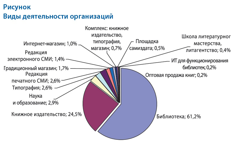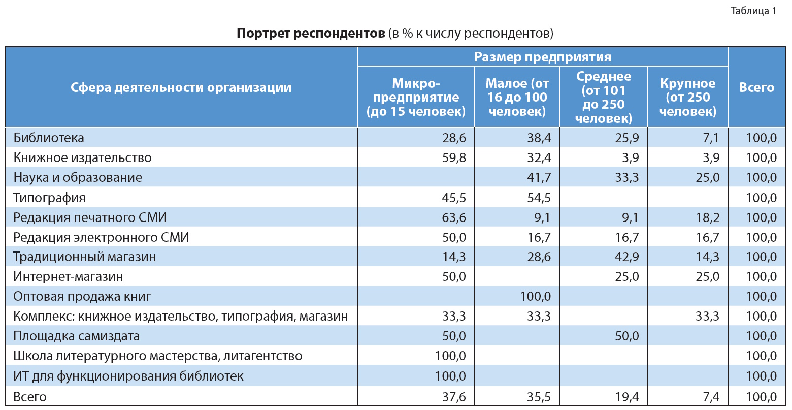 Таким образом, как показал анализ, в подавляющем большинстве участники исследования были представлены библиотеками (61,2%), в которых работают до 100 человек (67%), и книжными издательствами (24,5%), являющимися малыми и микропредприятиями (92,2%).