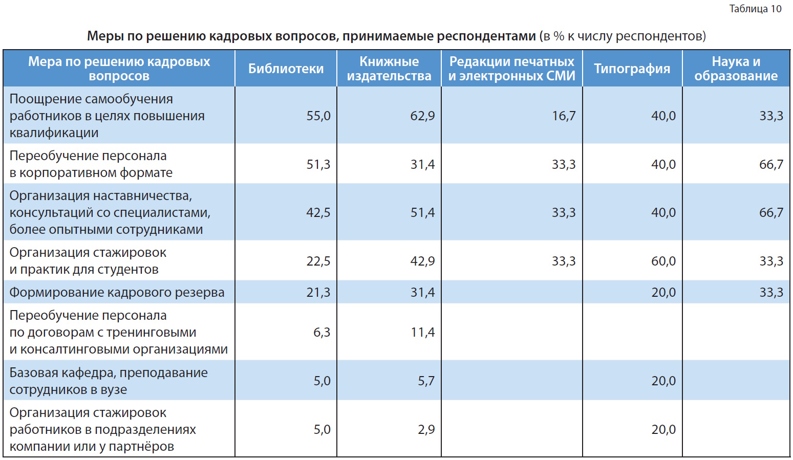 Что касается используемых респондентами мер по решению кадровых вопросов, то их распределение представлено в табл. 10.