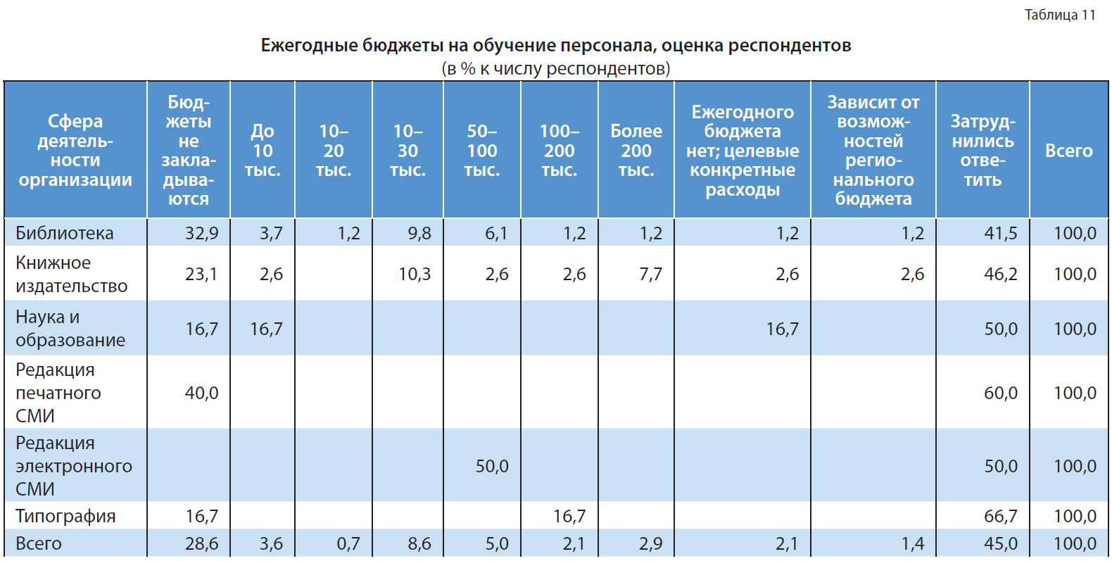 Затруднились ответить на этот вопрос 45% респондентов. О том, что бюджеты не закладываются, сообщили 28,6% опрошенных. Более или менее существенное финансирование (от 100 тыс. рублей в год) выделяют лишь 2,4% библиотек и 10,3% издательств. В частности, в Государственной библиотеке Югры отметили: «В субсидии на выполнение госзадания — ноль; осуществляем неформальное образование на базе Центра непрерывного образования учреждения». «Сотрудники проходят бесплатное повышение квалификации», — пояснили в Курганской областной детско-юношеской библиотеке им. В.Ф. Потанина. «Оплачиваются только проезд и проживание (командировка)», — указали в МУК «Муйская городская библиотека п. Таксимо». «Обучаем не часто. Как таковых бюджетов нет. Платим по ситуации и актуальности», — добавили в издательстве «Баско» (Екатеринбург). «Специального бюджета нет, поскольку это часть повседневной деятельности», — отметили в НИЦ «Ладомир». «Последние три года бюджет не выделялся», — посетовали в ООО Торговый дом книги «Москва».