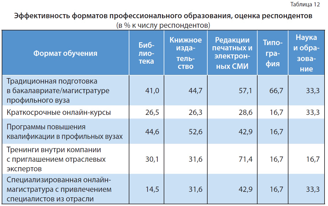 Как показывает анализ, практически во всех сферах деятельности большинство респондентов отдаёт предпочтение традиционной подготовке в бакалавриате или магистратуре профильного вуза (в НИЦ «Ладомир» напомнили и о специалитете). Также довольно высокую оценку получили программы повышения квалификации в профильных вузах. В пользу тренингов внутри компании с приглашением отраслевых экспертов высказалось подавляющее большинство специалистов из редакций СМИ. Кроме того, 42,9% из них высоко оценивают потенциал специализированной онлайн-магистратуры. За этот формат также высказалась треть респондентов из книжных издательств.