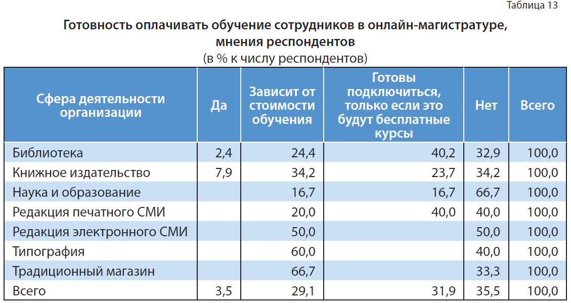 Готовность респондентов оплачивать обучение сотрудников в онлайн-магистратуре по программе, сконструированной с учётом результатов данного исследования и с привлечением ведущих специалистов отрасли, характеризуют данные табл. 13.